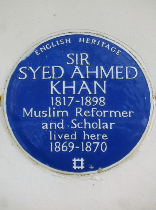 English Heritage blue plaque dedicated to Sir Syed. https://handwiki.org/wiki/index.php?curid=1733584