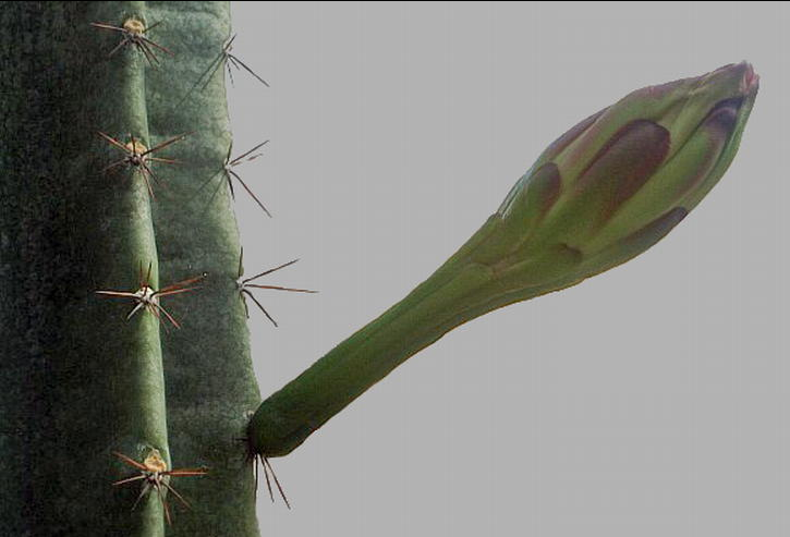 Echinopsis pachanoi is native to Ecuador and Peru. It is very different in appearance from L. williamsii. It has tall stems, up to high, with a diameter of , which branch from the base, giving the whole plant a shrubby or tree-like appearance. Archaeological evidence of the use of this cactus appears to date back to 2,000–2,300 years ago, with carvings and ceramic objects showing columnar cacti.[46] Although church authorities under the Spanish attempted to suppress its use, this failed, as shown by the Christian element in the common name "San Pedro cactus"—Saint Peter cactus. Anderson attributes the name to the belief that just as St Peter holds the keys to heaven, the effects of the cactus allow users "to reach heaven while still on earth." It continues to be used for its psychoactive effects, both for spiritual and for healing purposes, often combined with other psychoactive agents, such as Datura ferox and tobacco.[46] Several other species of Echinopsis, including E. peruviana, also contain mescaline.