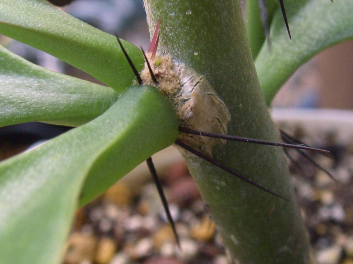 Areoles are structures unique to cacti. Although variable, they typically appear as woolly or hairy areas on the stems from which spines emerge. Flowers are also produced from areoles. In the genus Leuenbergeria, believed similar to the ancestor of all cacti, the areoles occur in the axils of leaves (i.e. in the angle between the leaf stalk and the stem).[3] In leafless cacti, areoles are often borne on raised areas on the stem where leaf bases would have been.