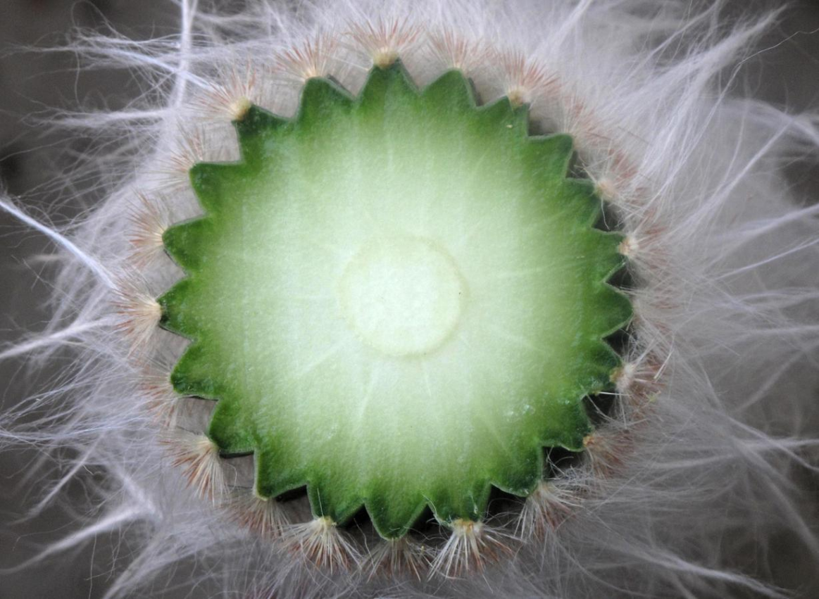 Areoles are highly specialized and very condensed shoots or branches. In a normal shoot, nodes bearing leaves or flowers would be separated by lengths of stem (internodes). In an areole, the nodes are so close together, they form a single structure. The areole may be circular, elongated into an oval shape, or even separated into two parts; the two parts may be visibly connected in some way (e.g. by a groove in the stem) or appear entirely separate (a dimorphic areole). The part nearer the top of the stem then produces flowers, the other part spines. Areoles often have multicellular hairs (trichomes) that give the areole a hairy or woolly appearance, sometimes of a distinct color such as yellow or brown.[2]