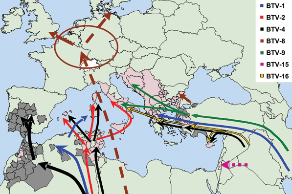 Bluetongue has been observed in Australia, the US, Africa, the Middle East, Asia, and Europe. An outline of the transmission cycle of BTV is illustrated in article Parasitic flies of domestic animals.
