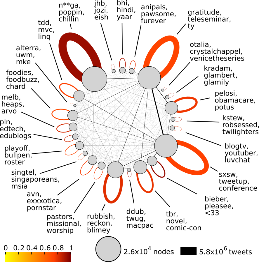 Not only do Twitter tribes have mutual interests,[6] but they also share potentially subconscious language features as found in the 2013 study by researchers from Royal Holloway University of London and Princeton. Dr. John Bryden from the School of Biological Sciences at Royal Holloway states that it is possible to anticipate which community somebody is likely to belong to,[7] with up to 80 percent accuracy. This research shows that people try to join societies based on the same interests and hobbies. In order to achieve this, publicly available messages were sent via Twitter to record conversations between two or more participants. As a result, each community can be characterised by their most used words. This approach can enrich new communities detection based on word analysis in order to automatically classify people inside social networks. The methods of identification of tribes relied heavily on algorithms and techniques from statistical physics, computational biology and network science.[8][9][10][11]