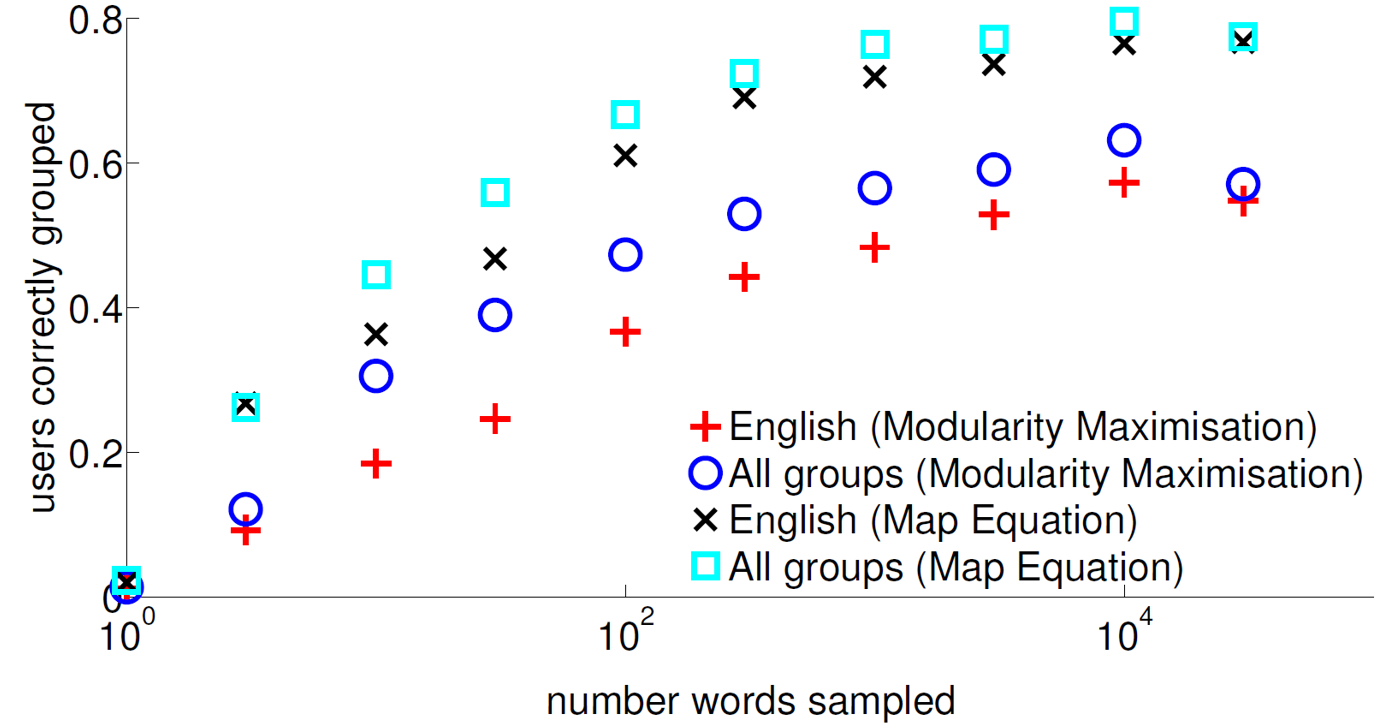 The problem of detecting the community features is one of the main issues in the study of networking systems. Social networks naturally tend to divide themselves into communities or modules.[15] However, some world networks are too big so they must be simplified before information can be extracted.[16] As a result, an effective way of dealing with this drawback for smaller communities is by using modularity algorithms in order to partition users into even smaller groups.[15] For larger ones, a more efficient algorithm called 'map equation' decomposes a network into modules by optimally compressing a description of information flows on the network.[16] Each community was therefore characterised according to the words they used the most, based on a ranking algorithm. To determine the significance of word usage differences, word endings and word lengths were also measured and showed that the pattern found was the correct one. Moreover, these studies also helped in predicting community membership of users, by comparing their own word frequencies with community word usage. This helped in forecasting which community a certain user is going to access based on the words that they are using.[8]