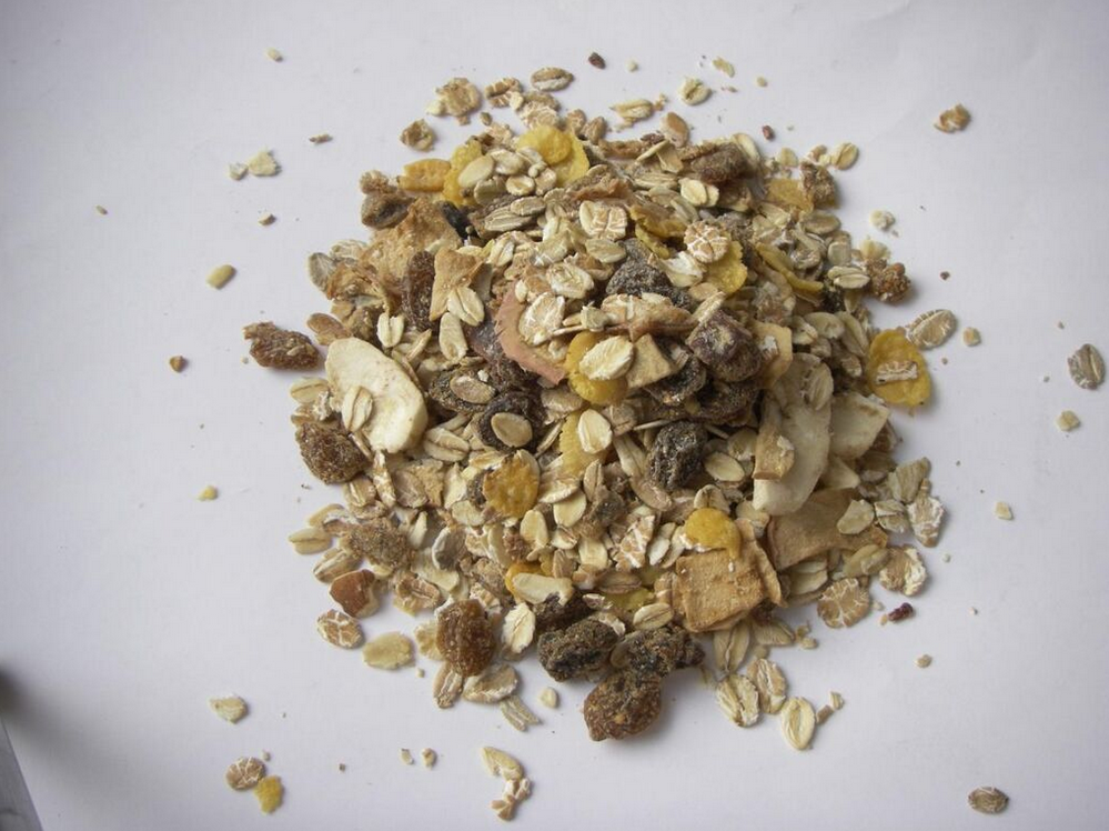 Packaged muesli is a loose mixture of mainly rolled oats or cornflakes together with various dried fruit pieces, nuts, and seeds – the main ingredients of any muesli. It commonly contains other rolled cereal grains such as wheat or rye flakes.