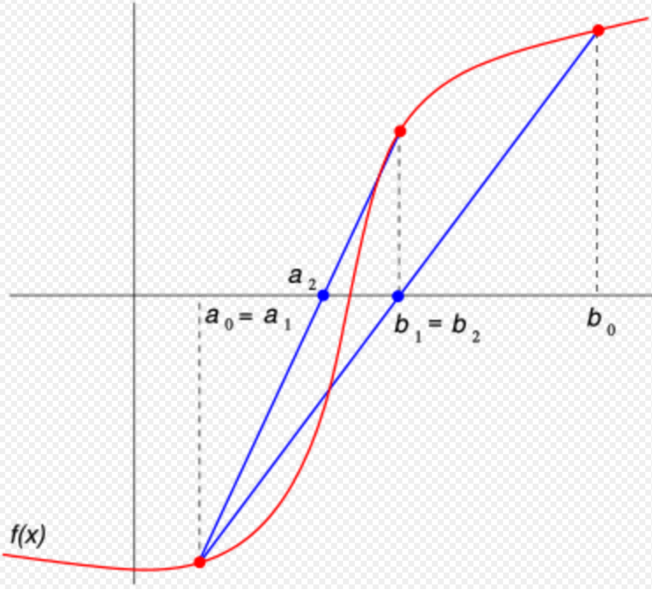 The regula falsi method calculates the new solution estimate as the x-intercept of the line segment joining the endpoints of the function on the current bracketing interval. Essentially, the root is being approximated by replacing the actual function by a line segment on the bracketing interval and then using the classical double false position formula on that line segment.[8]