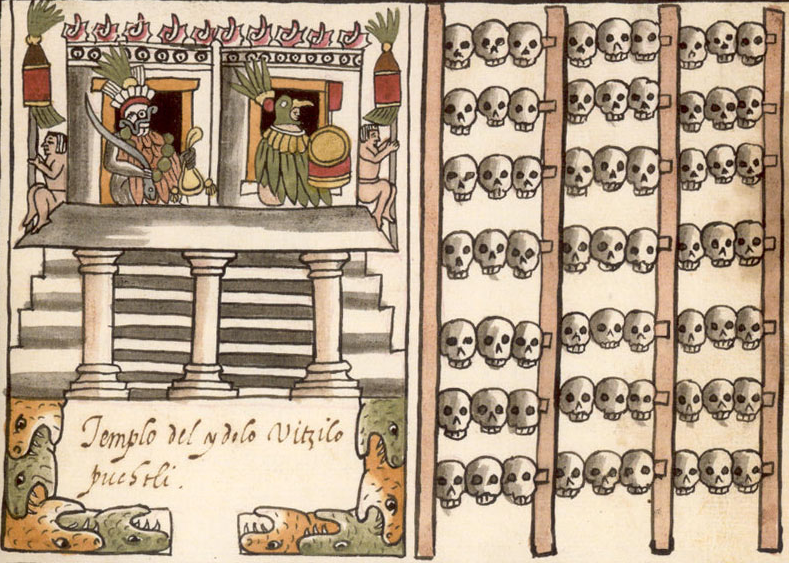 In Aztec mythology, Huitzilopochtli (Template:Lang-nci-IPA, modern Nahuatl pronunciation (help·info)) is the deity of war, sun, human sacrifice, and the patron of the city of Tenochtitlan. He was also the tribal god of the Mexicas, also known as the Aztecs, of Tenochtitlan. Many in the pantheon of deities of the Aztecs were inclined to have a fondness for a particular aspect of warfare. However, Huitzilopochtli was known as the primary god of war in ancient Mexico. Since he was the patron god of the Mexica, he was credited with both the victories and defeats that the Mexica people had on the battlefield. The people had to make sacrifices to him to protect the Aztec from infinite night. He wielded Xiuhcoatl, the fire serpent, as a weapon, thus also associating Huitzilopochtli with fire. As noted by the Spaniards during their discovery and conquest of the Aztec Empire (wherein they recorded the deity's name as Huichilobos), human sacrifice was common in worship ceremonies, which took place frequently and in numerous temples throughout the region, and when performed they typically sacrificed multiple victims per day at a given temple.