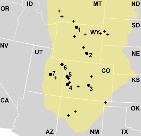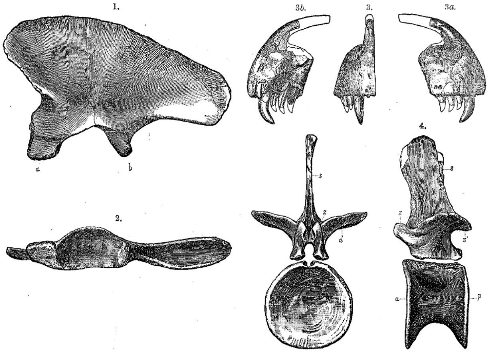 The discovery and early study of Allosaurus is complicated by the multiplicity of names coined during the Bone Wars of the late 19th century. The first described fossil in this history was a bone obtained secondhand by Ferdinand Vandeveer Hayden in 1869. It came from Middle Park, near Granby, Colorado, probably from Morrison Formation rocks. The locals had identified such bones as "petrified horse hoofs". Hayden sent his specimen to Joseph Leidy, who identified it as half of a tail vertebra, and tentatively assigned it to the European dinosaur genus Poekilopleuron as Poicilopleuron [sic] valens.[31] He later decided it deserved its own genus, Antrodemus.[32]