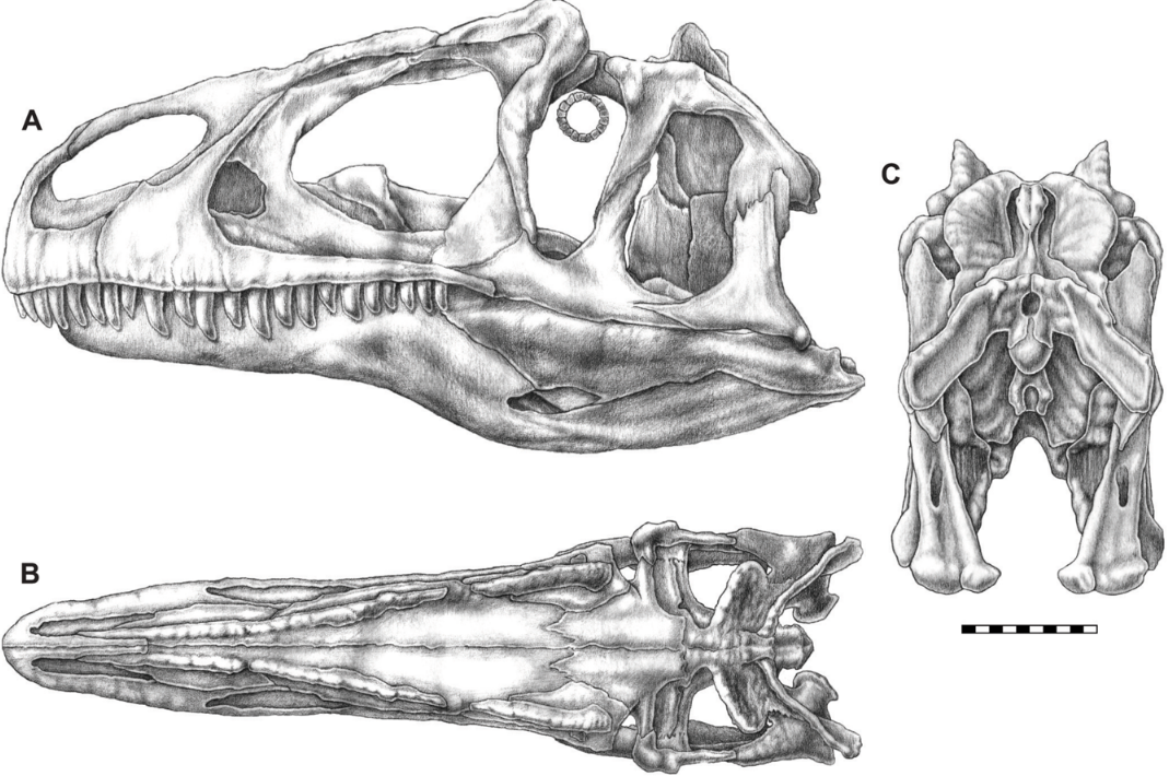 Inside the lacrimal bones were depressions that may have held glands, such as salt glands.[19] Within the maxillae were sinuses that were better developed than those of more basal theropods such as Ceratosaurus and Marshosaurus; they may have been related to the sense of smell, perhaps holding something like Jacobson's organs. The roof of the braincase was thin, perhaps to improve thermoregulation for the brain.[5] The skull and lower jaws had joints that permitted motion within these units. In the lower jaws, the bones of the front and back halves loosely articulated, permitting the jaws to bow outward and increasing the animal's gape.[20] The braincase and frontals may also have had a joint.[5]
