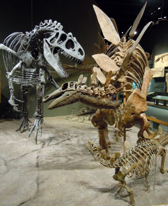 The Morrison Formation has been a rich fossil hunting ground. The flora of the period has been revealed by fossils of green algae, fungi, mosses, horsetails, ferns, cycads, ginkgoes, and several families of conifers. Animal fossils discovered include bivalves, snails, ray-finned fishes, frogs, salamanders, turtles, sphenodonts, lizards, terrestrial and aquatic crocodylomorphs, several species of pterosaur, numerous dinosaur species, and early mammals such as docodonts, multituberculates, symmetrodonts, and triconodonts. Dinosaurs known from the Morrison include the theropods Ceratosaurus, Ornitholestes, Tanycolagreus, and Torvosaurus, the sauropods Haplocanthosaurus, Camarasaurus, Cathetosaurus, Brachiosaurus, Suuwassea, Apatosaurus, Brontosaurus, Barosaurus, Diplodocus, Supersaurus, Amphicoelias, and Maraapunisaurus, and the ornithischians Camptosaurus, Dryosaurus, and Stegosaurus.[143] Allosaurus is commonly found at the same sites as Apatosaurus, Camarasaurus, Diplodocus, and Stegosaurus.[144] The Late Jurassic formations of Portugal where Allosaurus is present are interpreted as having been similar to the Morrison, but with a stronger marine influence. Many of the dinosaurs of the Morrison Formation are the same genera as those seen in Portuguese rocks (mainly Allosaurus, Ceratosaurus, Torvosaurus, and Stegosaurus), or have a close counterpart (Brachiosaurus and Lusotitan, Camptosaurus and Draconyx).[145]