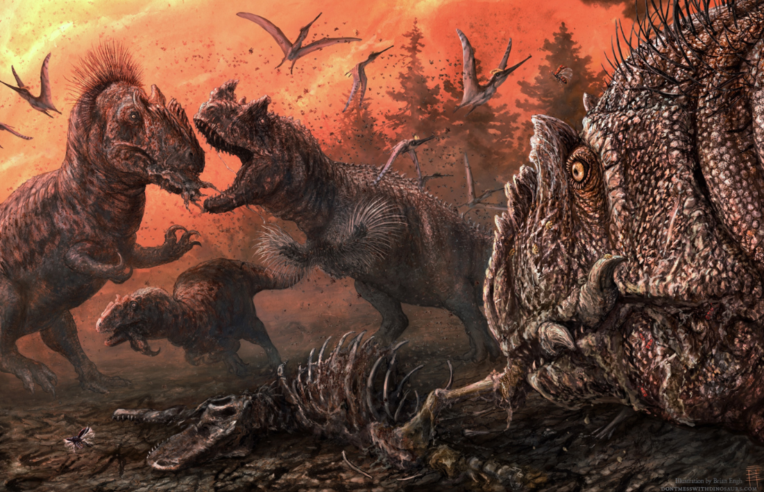 Although Allosaurus may have hunted in packs,[134] it has been argued that Allosaurus and other theropods had largely aggressive interactions instead of cooperative interactions with other members of their own species. The study in question noted that cooperative hunting of prey much larger than an individual predator, as is commonly inferred for theropod dinosaurs, is rare among vertebrates in general, and modern diapsid carnivores (including lizards, crocodiles, and birds) rarely cooperate to hunt in such a way. Instead, they are typically territorial and will kill and cannibalize intruders of the same species, and will also do the same to smaller individuals that attempt to eat before they do when aggregated at feeding sites. According to this interpretation, the accumulation of remains of multiple Allosaurus individuals at the same site; e.g., in the Cleveland–Lloyd Quarry, are not due to pack hunting, but to the fact that Allosaurus individuals were drawn together to feed on other disabled or dead allosaurs, and were sometimes killed in the process. This could explain the high proportion of juvenile and subadult allosaurs present, as juveniles and subadults are disproportionally killed at modern group feeding sites of animals like crocodiles and Komodo dragons. The same interpretation applies to Bakker's lair sites.[135] There is some evidence for cannibalism in Allosaurus, including Allosaurus shed teeth found among rib fragments, possible tooth marks on a shoulder blade,[136] and cannibalized allosaur skeletons among the bones at Bakker's lair sites.[137]