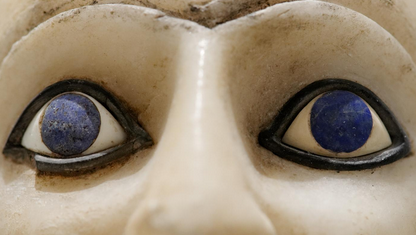 Lapis lazuli, a semi-precious stone, has been mined in Afghanistan for more than three thousand years, and was exported to all parts of the ancient world.[3] Blue glazed faience ornaments have been found to have been produced during 4th millennium civilization Indus Valley civilization (present day India and Pakistan).[4] In Iran and Mesopotamia, it was used to make jewellery and vessels. In Egypt, it was used for the eyebrows on the funeral mask of King Tutankhamun (1341–1323 BC).[5] Importing lapis lazuli by caravan across the desert from Afghanistan to Egypt was very expensive. Beginning in about 2500 BC, the ancient Egyptians began to produce their own blue pigment known as Egyptian blue by grinding silica, lime, copper, and alkalai, and heating it to 800 or 900 °C (1,470 or 1,650 °F). This is considered the first synthetic pigment.[6] Egyptian blue was used to paint wood, papyrus and canvas, and was used to colour a glaze to make faience beads, inlays, and pots. It was particularly used in funeral statuary and figurines and in tomb paintings. Blue was considered a beneficial colour which would protect the dead against evil in the afterlife. Blue dye was also used to colour the cloth in which mummies were wrapped.[7]