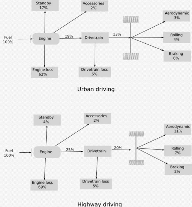 A diagram by the United States Department of Energy (DoE) shows cars with internal combustion engines as having efficiency of typically 13% in urban driving, 20% in highway conditions. Braking in proportion to the useful mechanic energy amounts to 6/13 i.e. 46% in towns, and 2/20 i.e. 10% on motorways.