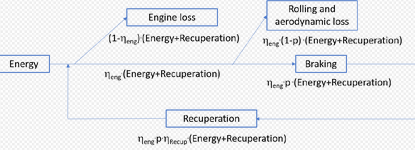 Let us introduce [math]\displaystyle{ \eta_\text{recup} }[/math] which is the recuperated proportion of braking energy. Let us assume [math]\displaystyle{ \eta_\text{recup}=0.6 }[/math].[59]