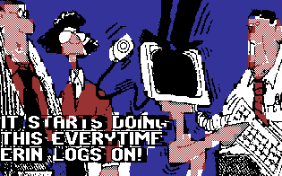 1 REM This source code is herewith released 2 REM by me into the Public Domain. 3 REM Bill Buckels, August 19, 2007 10 GRAPHIC 1,1 20 BLOAD "ERINLOG.HIR", B0, P8192 24 REM POKE I,16 will reverse video 25 FOR I = 7168 TO 8167:POKE I,1:NEXT I 30 GETKEY A$ 40 GRAPHIC 0,1 50 END