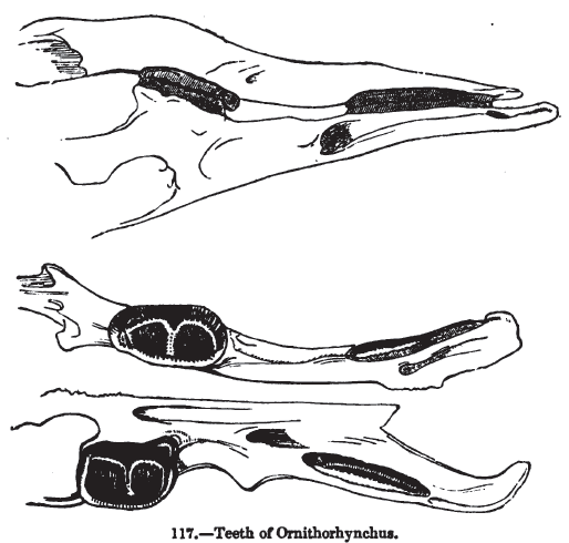 The oldest discovered fossil of the modern platypus dates back to about 100,000 years ago, during the Quaternary period. The extinct monotremes Teinolophos and Steropodon were once thought to be closely related to the modern platypus,[77] but are now considered more basal taxa.[80] The fossilised Steropodon was discovered in New South Wales and is composed of an opalised lower jawbone with three molar teeth (whereas the adult contemporary platypus is toothless). The molar teeth were initially thought to be tribosphenic, which would have supported a variation of Gregory's theory, but later research has suggested, while they have three cusps, they evolved under a separate process.[81] The fossil is thought to be about 110 million years old, making it the oldest mammal fossil found in Australia. Unlike the modern platypus (and echidnas), Teinolophos lacked a beak.[80]