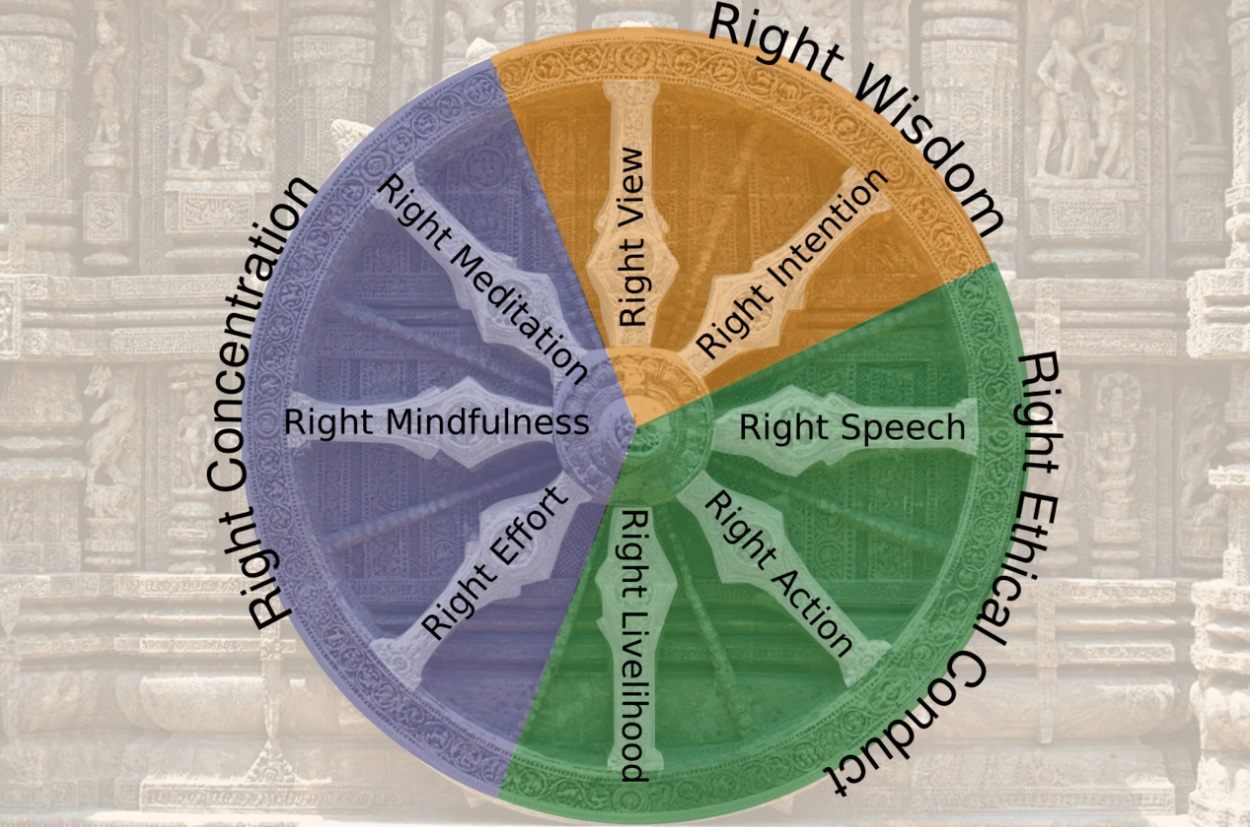 Buddhist scriptures explain the five precepts as the minimal standard of Buddhist morality.[1] It is the most important system of morality in Buddhism, together with the monastic rules.[2] Śīla (Sanskrit; Pali: sīla) is used to refer to Buddhist precepts,[3] including the five.[4] But the word also refers to the virtue and morality which lies at the foundation of the spiritual path to enlightenment, which is the first of the three forms of training on the path. Thus, the precepts are rules or guidelines to develop mind and character to make progress on the path to enlightenment.[4] The five precepts are part of the right speech, action and livelihood aspects of the eight-fold path, the core teaching of Buddhism.[4][5][6] Moreover, the practice of the five precepts and other parts of śīla are described as forms of merit-making, means to create good karma.[7][8] The five precepts have been described as social values that bring harmony to society,[9][10] and breaches of the precepts described as antithetical to a harmonious society.[11] On a smilar note, in Buddhist texts, the ideal, righteous society is one in which people keep five precepts.[12]