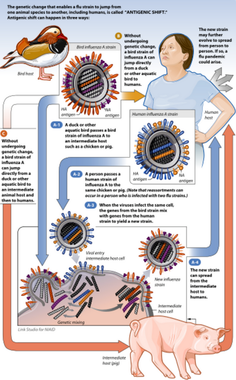 Swine can be infected by both avian and human flu strains of influenza, and therefore are hosts where the antigenic shifts can occur that create new influenza strains. https://handwiki.org/wiki/index.php?curid=2080594