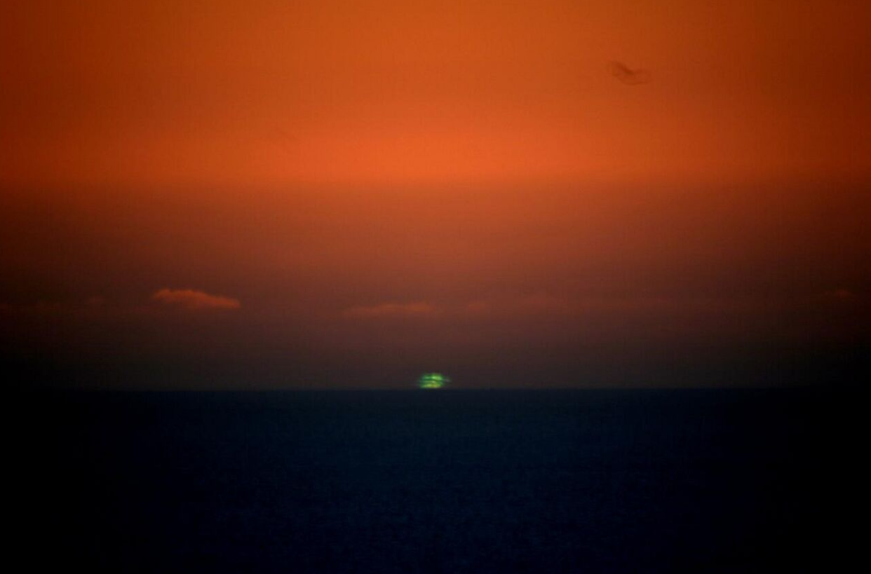 The Sun can sometimes appear as a green spot for a second or two as it is rising or setting: this is known as green flash. Roughly speaking, the red light from the Sun is blocked by Earth, the blue light is scattered by the atmosphere, and the green light is refracted by the atmosphere to the observer.[11]