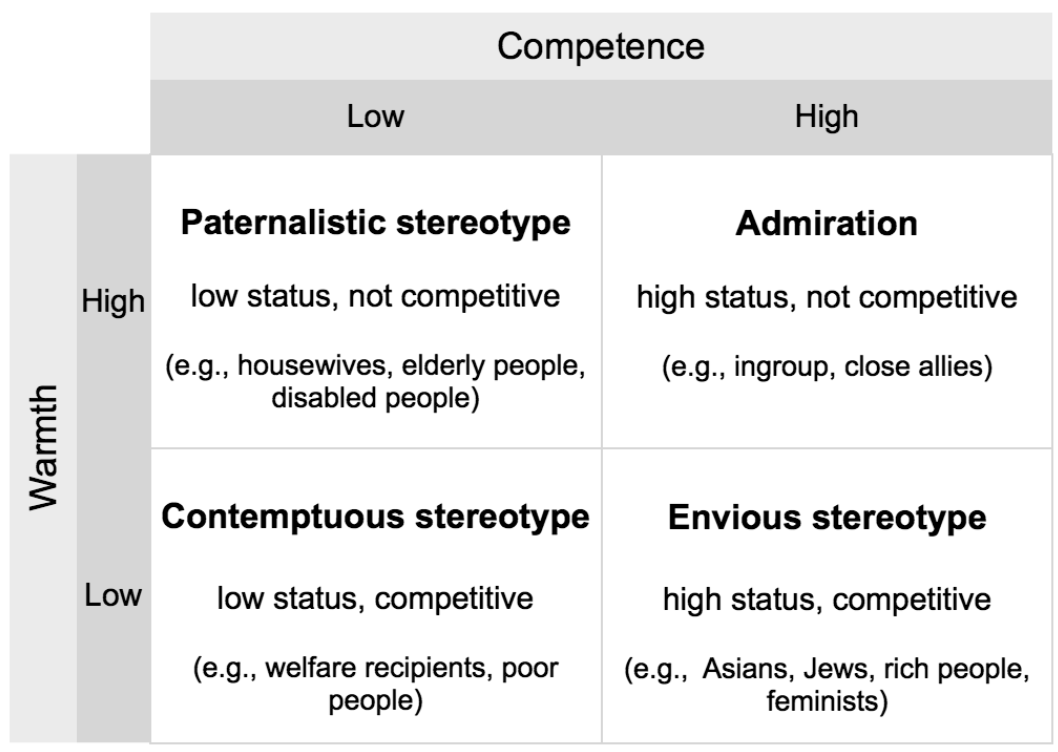 The researchers indicated that the motivation to positively stereotype groups as either warm or competent stemmed from perceived status and competition of an out-group. According to the SCM, out-groups are positively stereotyped as more competent to the extent that they are more powerful or hold higher-status. And correspondingly, out-groups are positively stereotyped as more warm to the extent that they are seen as less competition. However being positively stereotyped on one dimension usually corresponded with being negatively stereotyped on the other dimension.