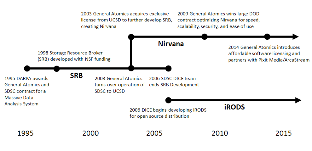 In 2003, General Atomics turned over operation of the SDSC to the University of California San Diego (UCSD) and Dr. Moore became a full-time professor there establishing the Data Intensive Computing Environments (DICE) Center, continuing development of SRB. In that same year, General Atomics acquired the exclusive license to develop a commercial version of SRB, calling it Nirvana.[4] The DICE team ended development of SRB in 2006 and started a rules oriented data management project called iRODS[5] for open source distribution. Dr. Moore and his DICE team relocated to the University of North Carolina at Chapel Hill where iRODS is now maintained by the iRODS Consortium.[6] General Atomics continued development of Nirvana at their San Diego headquarters, focusing on capabilities to serve government and commercial users, including high scalability, fail-over, performance, implementation, maintenance and support.