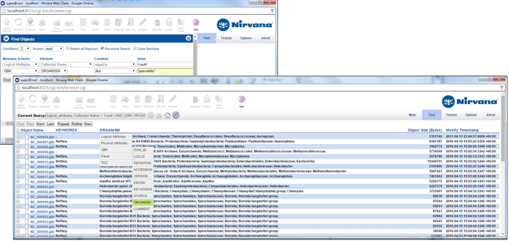 Nirvana can be used to conduct search queries to find data of interest using both system and user-defined metadata. Queries are either entered in the Command Line Interface or through the Web browser client shown below.