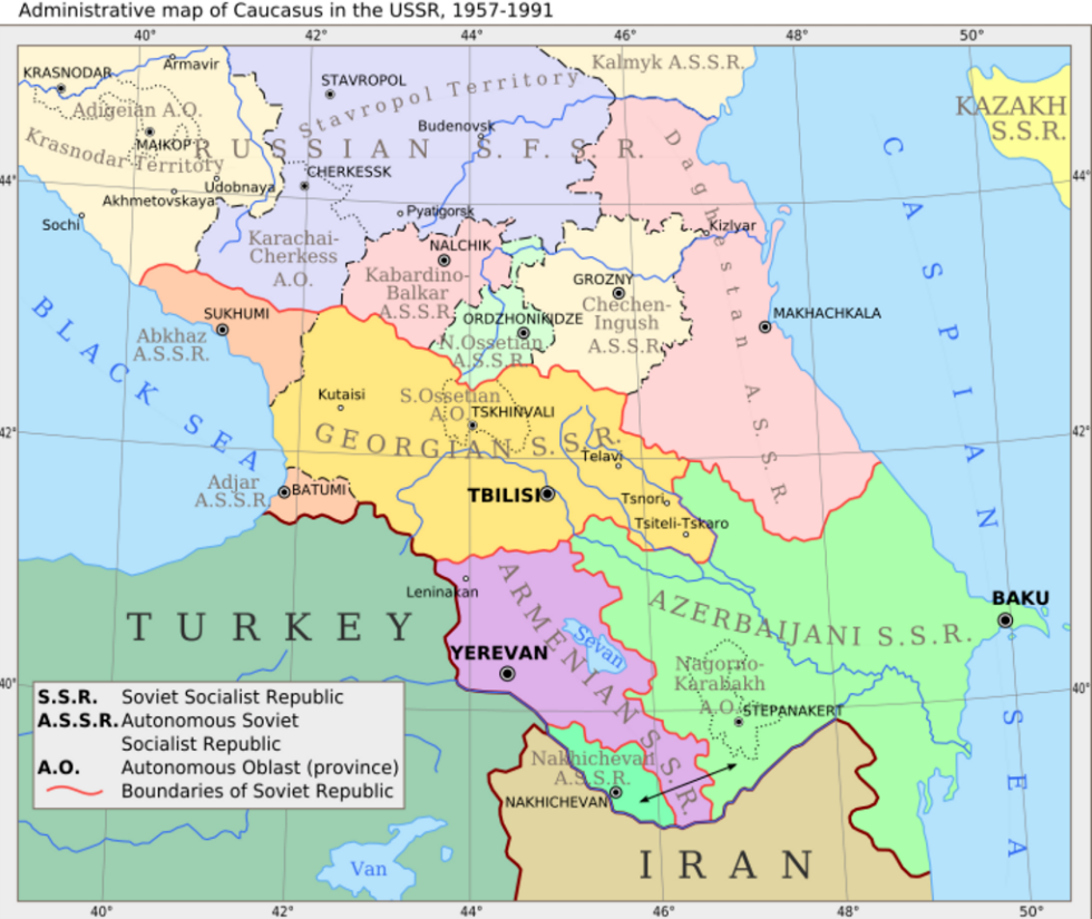 All of present-day Armenia is in Transcaucasia; the majority of present-day Georgia and Azerbaijan, including the exclave of Nakhchivan, also fall within the region. Parts of Iran and Turkey are also included within the region of Transcaucasia.[1] Goods produced in the region include oil, manganese ore, tea, citrus fruits, and wine. It remains one of the most politically tense regions in the post-Soviet area, and contains three heavily disputed areas: Abkhazia, South Ossetia, and Nagorno-Karabakh. Between 1878 and 1917 the Russian-controlled province of Kars Oblast was also incorporated into the Transcaucasus.