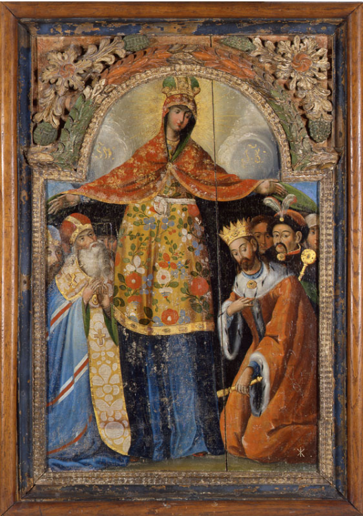 With some reservations, the Pokrov icon may be related to the Western Virgin of Mercy image, in which the Virgin spreads wide her cloak to cover and protect a group of kneeling supplicants (first known from Italy from about 1280).