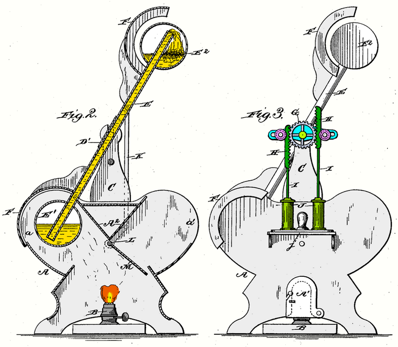 In 1881 Israel L. Landis got a patent for a similar oscillating motor.[14] A year later (1882), the Iske brothers got a patent for a similar motor.[15] Unlike the drinking bird, the lower tank was heated and the upper tank just air-cooled in this engine. Other than that, it used the same principle. The Iske brothers during that time got various patents on a related engine which is now known as Minto wheel.