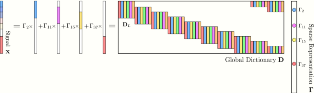 A local prior is adopted such that each overlapping section of [math]\displaystyle{ \mathbf{\Gamma} }[/math] is sparse. Let [math]\displaystyle{ \mathbf{D}\in \mathbb{R}^{N \times Nm} }[/math] be constructed from shifted versions of a local dictionary [math]\displaystyle{ \mathbf{D_{L}}\in\mathbb{R}^{n \times m}, m\ll M }[/math]. Then, [math]\displaystyle{ \mathbf{x} }[/math] is formed by products between [math]\displaystyle{ \mathbf{D_{L}} }[/math] and local patches of [math]\displaystyle{ \mathbf{\Gamma}\in\mathbb{R}^{mN} }[/math].
