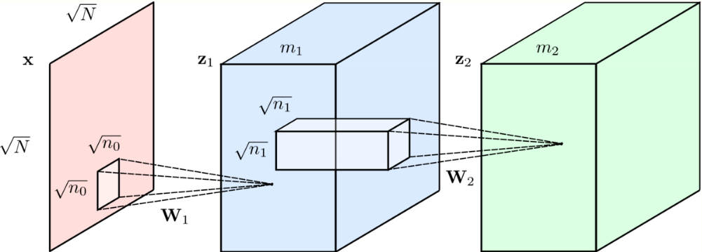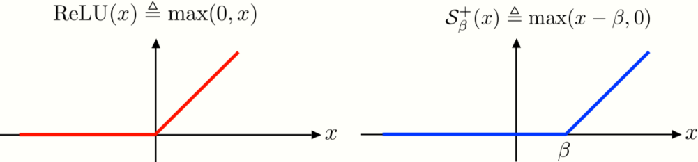 Recall the Forward Pass of the Convolutional Neural Network (CNN) model, used in both training and inference steps. Let [math]\displaystyle{ \mathbf{x}\in \mathbb{R}^{Mm_{1}} }[/math] be its input and [math]\displaystyle{ \mathbf{W}_{k}\in\mathbb{R}^{N\times m_{1}} }[/math] the filters at layer [math]\displaystyle{ k }[/math], which are followed by the Rectified Linear Unit [math]\displaystyle{ \text{ReLU}(\mathbf{x})= \max(0, x) }[/math], for bias [math]\displaystyle{ \mathbf{b}\in \mathbb{R}^{Mm_{1}} }[/math]. Based on this elementary block, taking [math]\displaystyle{ K=2 }[/math] as example, the CNN output can be expressed as: [math]\displaystyle{ \begin{aligned} \mathbf{Z}_{2}&= \text{ReLU}\big(\mathbf{W}_{2}^{T}\; \text{ReLU}(\mathbf{W}_{1}^{T}\mathbf{x})+\mathbf{b}_{1})+\mathbf{b}_{2}\;\big).\end{aligned} }[/math] Finally, comparing the CNN algorithm and the Layered thresholding approach for the nonnegative constaint [sic?], it is straightforward to show that both are equivalent: [math]\displaystyle{ \begin{aligned} \hat{\mathbf{\Gamma}}&= \mathcal{S}^{+}_{\beta_{2}}\big(\mathbf{D}_{2}^{T}\mathcal{S}^{+}_{\beta_{1}}(\mathbf{D}_{1}^{T}\mathbf{x}) \big)\\ &= \text{ReLU}\big(\mathbf{W}_{2}^{T} \text{ReLU}(\mathbf{W}_{1}^{T}\mathbf{x}+\beta_{1})+\beta_{2}\big).\end{aligned} }[/math]