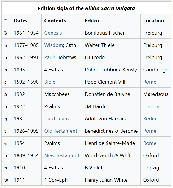 This edition, alternatively titled Biblia Sacra Vulgata or Biblia Sacra iuxta vulgatam versionem, is a "manual edition" in that it reduces much of the information in the large multivolume critical editions of Oxford and Rome into a handheld format, identifying the primary manuscript witnesses used by those editors to establish their texts (with some adjustments); and providing variant readings from the more significant early Vulgate manuscripts and printed editions. The first editions were published as two volumes, but the fourth (1994) and fifth (2007) editions were published as a single volume with smaller pages. The text reproduces and updates those of the Rome edition and the Oxford Edition for the Old Testament, Gospels, Acts and the earlier Pauline epistles; with changes mainly limited to standardisation of orthography. In the later New Testament books (those where the Oxford editors had retained the text of the 1911 editio minor unchanged), the Stuttgart editors felt justified in making a greater number of critical changes, especially as H.F.D. Sparks himself was included among their number. The text has not been modified substantially since the third edition of 1983, but the apparatus has been rewritten for many books in more recent editions, based for example on new findings concerning the Vetus Latina from the work of the Vetus Latina Institute, Beuron. Like the editions of Oxford and Rome, it attempts, through critical comparison of the most significant historical manuscripts of the Vulgate, to recreate an early text, cleansed of the scribal errors and scholarly contaminations of a millennium. Thus it does not always represent what might have been read in the later Middle Ages.
