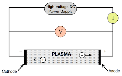 Just like the many uses of plasma, there are several means for its generation. However, one principle is common to all of them: there must be energy input to produce and sustain it.[44] For this case, plasma is generated when an electric current is applied across a dielectric gas or fluid (an electrically non-conducting material) as can be seen in the adjacent image, which shows a discharge tube as a simple example (DC used for simplicity).