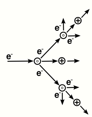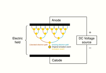 The potential difference and subsequent electric field pull the bound electrons (negative) toward the anode (positive electrode) while the cathode (negative electrode) pulls the nucleus.[45] As the voltage increases, the current stresses the material (by electric polarization) beyond its dielectric limit (termed strength) into a stage of electrical breakdown, marked by an electric spark, where the material transforms from being an insulator into a conductor (as it becomes increasingly ionized). The underlying process is the Townsend avalanche, where collisions between electrons and neutral gas atoms create more ions and electrons (as can be seen in the figure on the right). The first impact of an electron on an atom results in one ion and two electrons. Therefore, the number of charged particles increases rapidly (in the millions) only "after about 20 successive sets of collisions",[46] mainly due to a small mean free path (average distance travelled between collisions).