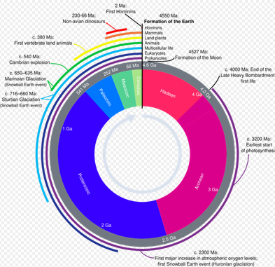 The geological time scale encompasses the history of the Earth.[7] It is bracketed at the earliest by the dates of the first Solar System material at 4.567 Ga[8] (or 4.567 billion years ago) and the formation of the Earth at 4.54 Ga[9][10] (4.54 billion years), which is the beginning of the informally recognized Hadean eon – a division of geological time. At the later end of the scale, it is marked by the present day (in the Holocene epoch).