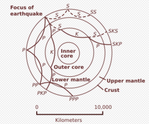 Seismologists can use the arrival times of seismic waves to image the interior of the Earth. Early advances in this field showed the existence of a liquid outer core (where shear waves were not able to propagate) and a dense solid inner core. These advances led to the development of a layered model of the Earth, with a crust and lithosphere on top, the mantle below (separated within itself by seismic discontinuities at 410 and 660 kilometers), and the outer core and inner core below that. More recently, seismologists have been able to create detailed images of wave speeds inside the earth in the same way a doctor images a body in a CT scan. These images have led to a much more detailed view of the interior of the Earth, and have replaced the simplified layered model with a much more dynamic model.