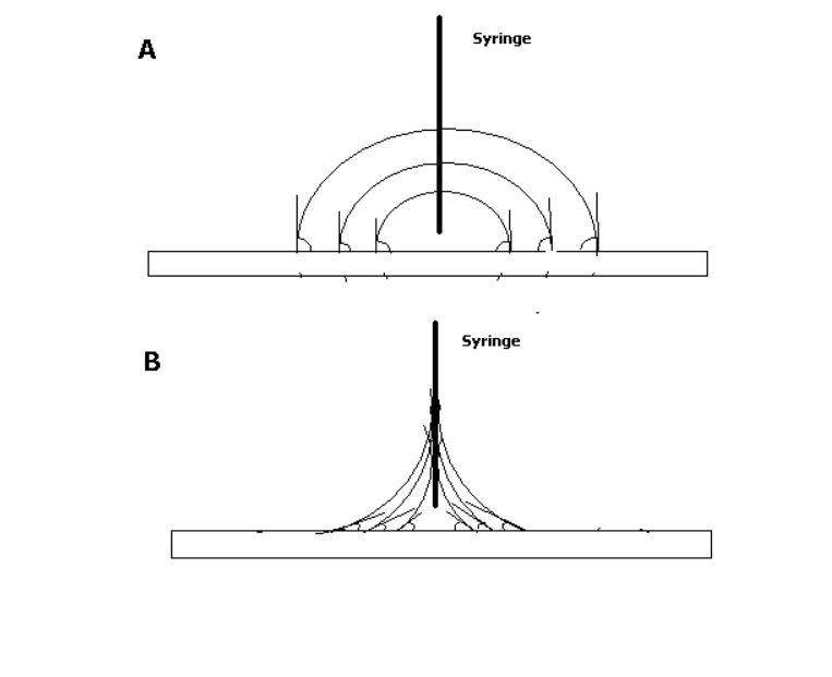 The advantage of this method, aside from its relatively straightforward nature, is the fact that with a large enough solid surface, multiple droplets can be deposited in various locations on the sample to determine heterogeneity. The reproducibility of particular values of the contact angle will reflect the heterogeneity of the surface's energy properties. Conversely, the disadvantage is that if the sample is only large enough for one droplet, then it will be difficult to determine heterogeneity, or consequently to assume homogeneity. This is particularly true because conventional, commercially available goniometers do not swivel the camera/backlight set up relative to the stage, and thus can only show the contact angle at two points: the right and the left edge of the droplet. In addition to this, this measurement is hampered by its inherent subjectivity, as the placement of the lines is determined either by the user looking at the pictures or by the image analysis software's definition of the lines.