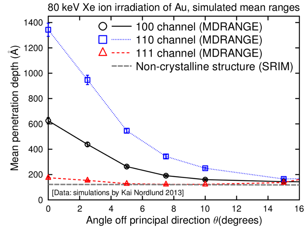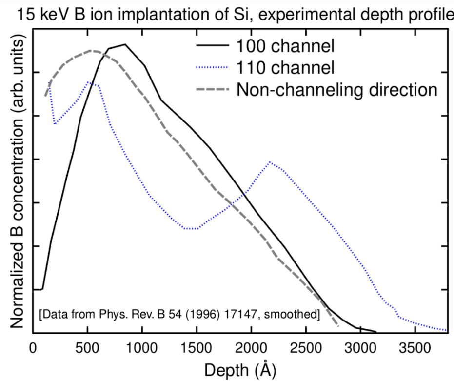 From a simple, classical standpoint, one may qualitatively understand the channelling effect as follows: If the direction of a charged particle incident upon the surface of a monocrystal lies close to a major crystal direction (Fig. 1), the particle with high probability will only do small-angle scattering as it passes through the several layers of atoms in the crystal and hence remain in the same crystal 'channel'. If it is not in a major crystal direction or plane ("random direction", Fig. 2), it is much more likely to undergo large-angle scattering and hence its final mean penetration depth is likely to be shorter. If the direction of the particle's momentum is close to the crystalline plane, but it is not close to major crystalline axes, this phenomenon is called "planar channelling". Channelling usually leads to deeper penetration of the ions in the material, an effect that has been observed experimentally and in computer simulations, see Figures 3-5.[4]
