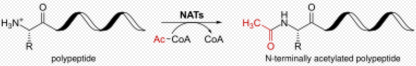 N-terminal Acetylation is catalyzed by a set of enzyme complexes, the N-terminal acetyltransferases (NATs). NATs transfer an acetyl group from acetyl-coenzyme A (Ac-CoA) to the α-amino group of the first amino acid residue of the protein. Different NATs are responsible for the acetylation of nascent protein N-terminal, and the acetylation was found to be irreversible so far.[7]