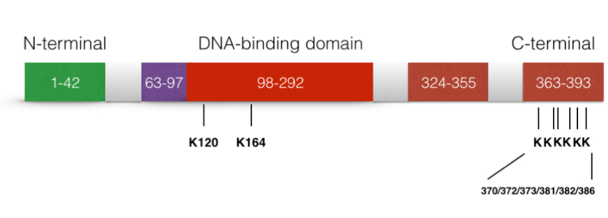 The acetylation of p53 is indispensable for its activation. It has been reported that the acetylation level of p53 will increase significantly when cell undergo stress. There are three major acetylation sites on p53: K164, K120 and C terminus.[36] If only one of the acetylation sites is defected, the activation of p21 is still observed. However, if all three activation sites are blocked, the activation of p21 and the suppression of cell growth caused by p53 will be completely lost. In addition, the acetylation of p53 prevents its binding to the repressor Mdm2 on DNA.[37] In addition, it is suggested that the p53 acetylation is crucial for its transcription-independent proapoptotic functions.[38]