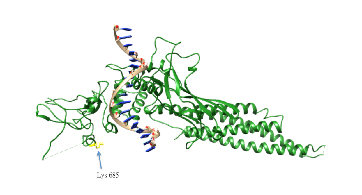 The acetylation of Lys685 of STAT3 is important for STAT3 homo-dimerization, which is essential for the DNA-binding and the transcriptional activation of oncogenes. The acetylation of STAT3 is catalyzed by histone acetyltransferase p300, and reversed by type 1 histone deacetylase. The lysine acetylation of STAT3 is also elevated in cancer cells.[51]