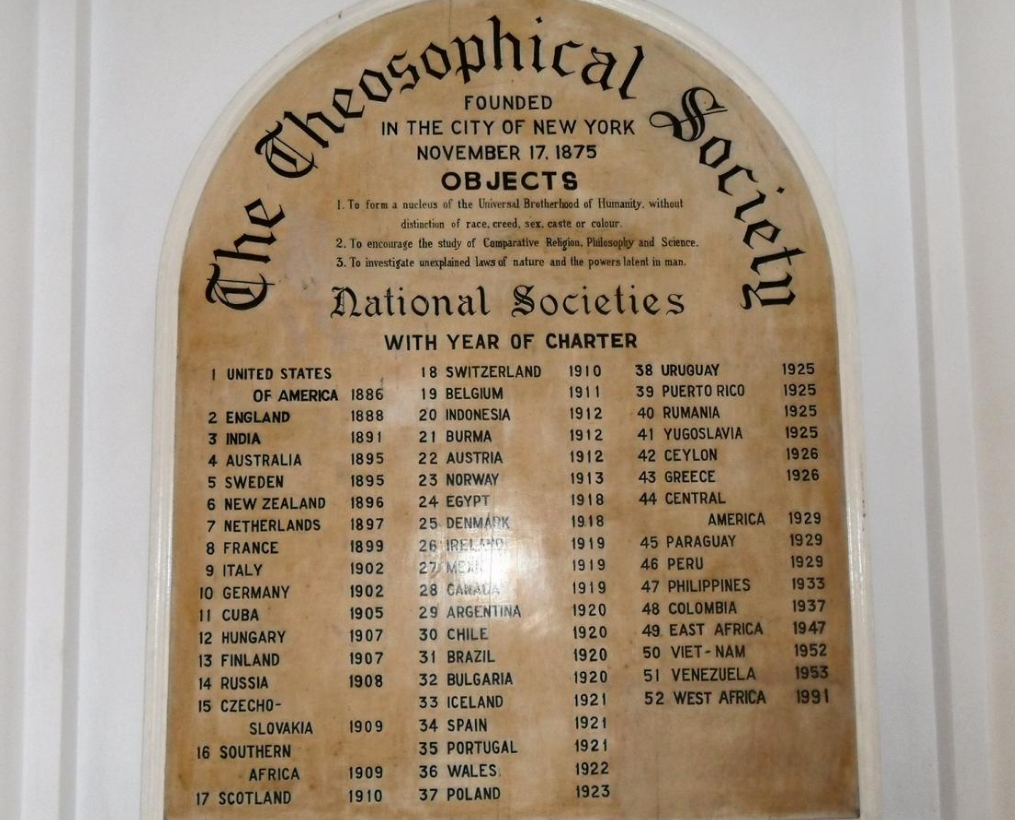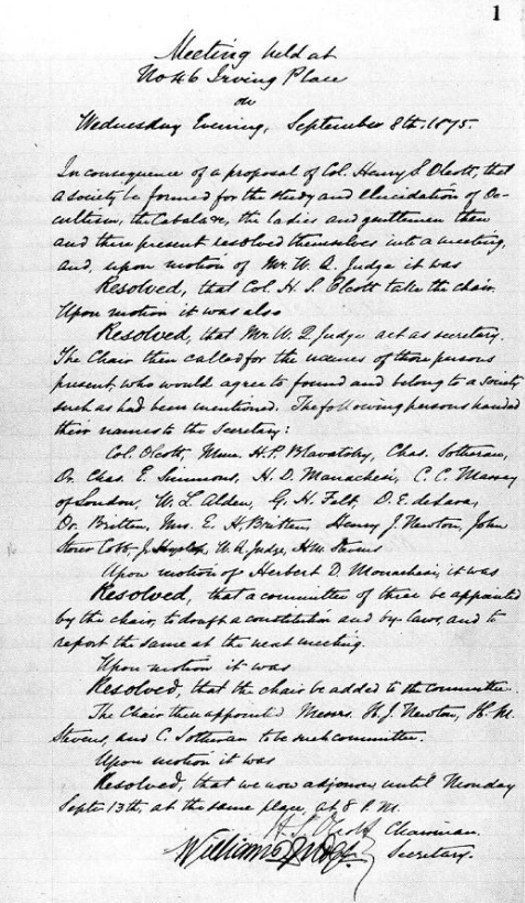 The Theosophical Society was officially formed in New York City , United States, on 17 November 1875 by Helena Petrovna Blavatsky, Colonel Henry Steel Olcott, William Quan Judge, and others.[1] It was self-described as "an unsectarian body of seekers after Truth, who endeavour to promote Brotherhood and strive to serve humanity." Olcott was its first president, and remained president until his death in 1907. In the early months of 1875, Olcott and Judge had come to realize that, if Blavatsky was a spiritualist, she was no ordinary one.[2] The society's initial objective was the "study and elucidation of Occultism, the Cabala etc."[3] After a few years Olcott and Blavatsky moved to India and established the International Headquarters at Adyar, in Madras (now Chennai). They were also interested in studying Eastern religions, and these were included in the Society's agenda.[4] After several iterations the Society's objectives evolved to be:
