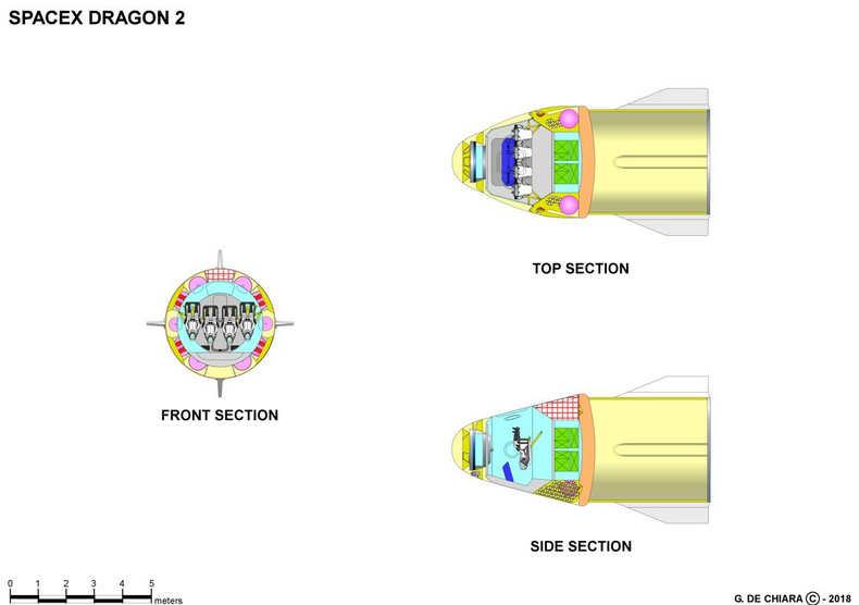 Dragon 2 includes the following features:[22][23][28] Dragon 2 is partially reusable, potentially resulting in a significant cost reduction. SpaceX plans to use new capsules for every crewed flight for NASA.[29] Cargo Dragon can carry 3,307 kilograms (7,291 lb) to the ISS; Crew Dragon has a capacity of seven astronauts (only four seats are used for NASA missions). Above the seats, there is a three-screen control panel, a toilet (with privacy curtain) and the docking hatch. Ocean landings are accomplished with four main parachutes in both variants. The parachute system was fully redesigned from the one used in the prior Dragon capsule, due to the need to deploy the parachutes under a variety of launch abort scenarios.[30]