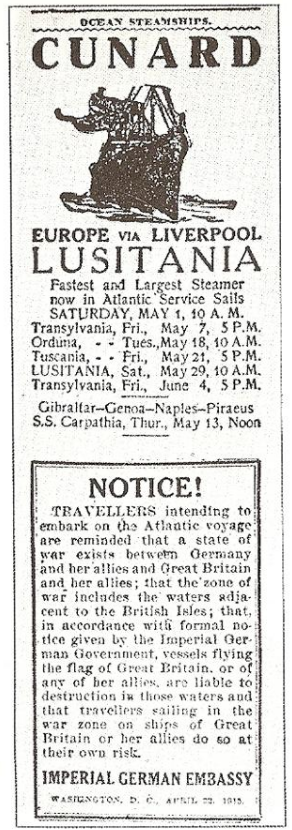 On 7 May 1915, the liner RMS Lusitania was torpedoed by U-20, 13 mi (21 km) off the Old Head of Kinsale, Ireland, and sank in just 18 minutes. Of the 1,959 people aboard, 1,198 were killed, 128 of them US citizens.