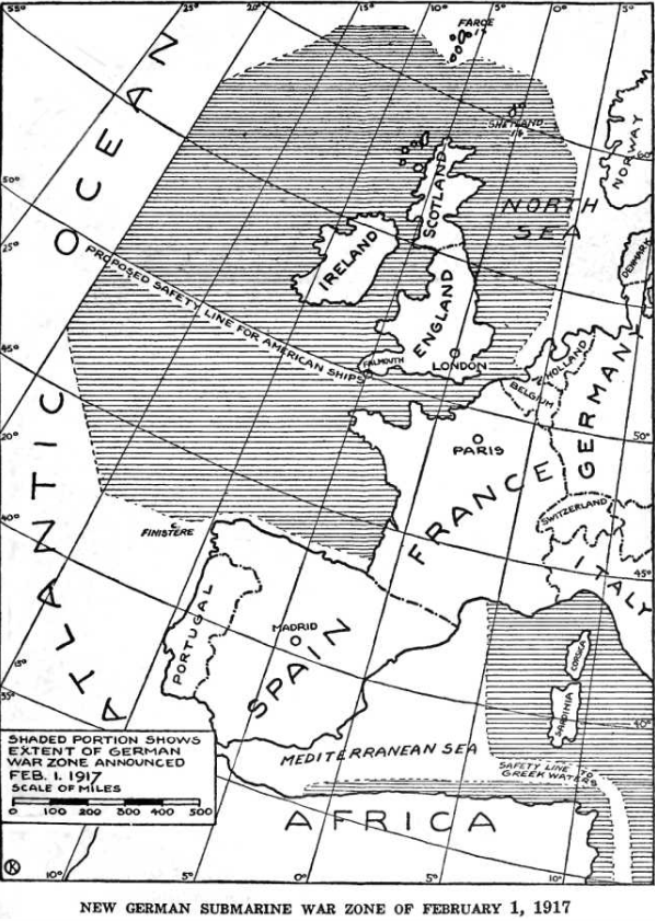 The shaded areas show the unrestricted submarine warfare zone announced by Germany on 1 February 1917. https://handwiki.org/wiki/index.php?curid=1710752
