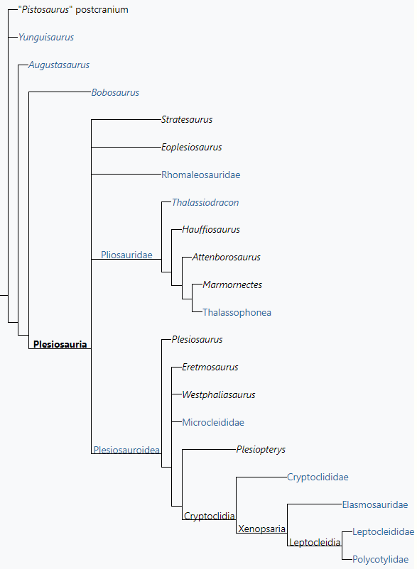 Benson et al. (2012) found the traditional Pliosauroidea to be paraphyletic in relation to Plesiosauroidea. Rhomaleosauridae was found to be outside Neoplesiosauria, but still within Plesiosauria. The early Carnian pistosaur Bobosaurus was found to be one step more advanced than Augustasaurus in relation to the Plesiosauria and therefore it represented by definition the basalmost known plesiosaur. This analysis focused on basal plesiosaurs and therefore only one derived pliosaurid and one cryptoclidian were included, while elasmosaurids were not included at all. A more detailed analysis published by both Benson and Druckenmiller in 2014 was not able to resolve the relationships among the lineages at the base of Plesiosauria.[50]
