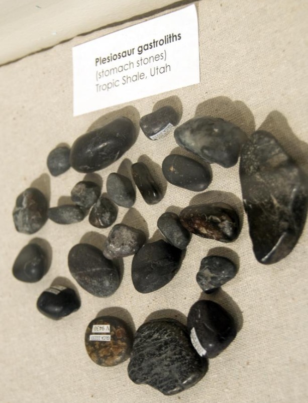 Skeletons have also been discovered with gastroliths, stones, in their stomachs, though whether to help break down food, especially cephalopods, in a muscular gizzard, or to vary buoyancy, or both, has not been established.[77][78] However, the total weight of the gastroliths found in various specimens appears to be insufficient to modify the buoyancy of these large reptiles.[79] The first plesiosaur gastroliths, found with Mauisaurus gardneri, were reported by Harry Govier Seeley in 1877.[80] The number of these stones per individual is often very large. In 1949, a fossil of Alzadasaurus (specimen SDSM 451, later renamed to Styxosaurus) showed 253 of them.[81] The size of individual stones is often considerable. In 1991 an elasmosaurid specimen, KUVP 129744, was investigated, containing a gastrolith with a diameter of seventeen centimetres and a weight of 1300 grams; and a somewhat shorter stone of 1490 grams. In total, forty-seven gastroliths were present, with a combined weight of 13 kilograms. The size of the stones has been seen as an indication that they were not swallowed by accident, but deliberately, the animal perhaps covering large distances in search of a suitable rock type.[82]