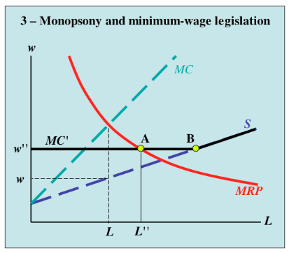 Such a case is a type of market failure and results in workers being paid less than their marginal value. Under the monopsonistic assumption, an appropriately set minimum wage could increase both wages and employment, with the optimal level being equal to the marginal product of labor.[44] This view emphasizes the role of minimum wages as a market regulation policy akin to antitrust policies, as opposed to an illusory "free lunch" for low-wage workers.
