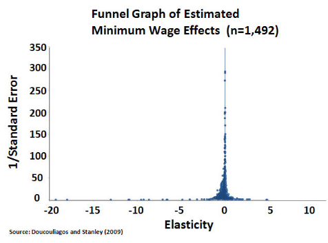 In 2005, T.D. Stanley showed that Card and Krueger's results could signify either publication bias or the absence of a minimum wage effect. However, using a different methodology, Stanley concluded that there is evidence of publication bias and that correction of this bias shows no relationship between the minimum wage and unemployment.[94] In 2008, Hristos Doucouliagos and T.D. Stanley conducted a similar meta-analysis of 64 U.S. studies on disemployment effects and concluded that Card and Krueger's initial claim of publication bias is still correct. Moreover, they concluded, "Once this publication selection is corrected, little or no evidence of a negative association between minimum wages and employment remains."[95] In 2013, a meta-analysis of 16 UK studies found no significant effects on employment attributable to the minimum wage.[96] a 2007 meta-analyses by David Neumark of 96 studies found a consistent, but not always statistically significant, negative effect on employment from increases in the minimum wage.[97]