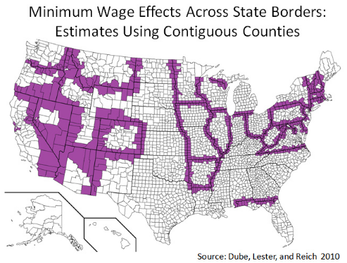 Further application of the methodology used by Card and Krueger by other researchers yielded results similar to their original findings, across additional data sets.[70] A 2010 study by three economists (Arindrajit Dube of the University of Massachusetts Amherst, William Lester of the University of North Carolina at Chapel Hill, and Michael Reich of the University of California, Berkeley), compared adjacent counties in different states where the minimum wage had been raised in one of the states. They analyzed employment trends for several categories of low-wage workers from 1990 to 2006 and found that increases in minimum wages had no negative effects on low-wage employment and successfully increased the income of workers in food services and retail employment, as well as the narrower category of workers in restaurants.[70][71]