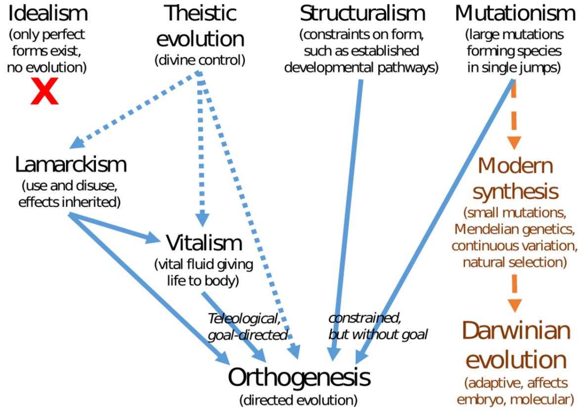 Biological or process structuralism is a school of biological thought that objects to an exclusively Darwinian or adaptationist explanation of natural selection such as is described in the 20th century's modern synthesis. It proposes instead that evolution is guided differently, basically by more or less physical forces which shape the development of an animal's body, and sometimes implies that these forces supersede selection altogether. Structuralists have proposed different mechanisms that might have guided the formation of body plans. Before Darwin, Étienne Geoffroy Saint-Hilaire argued that animals shared homologous parts, and that if one was enlarged, the others would be reduced in compensation. After Darwin, D'Arcy Thompson hinted at vitalism and offered geometric explanations in his classic 1917 book On Growth and Form. Adolf Seilacher suggested mechanical inflation for "pneu" structures in Ediacaran biota fossils such as Dickinsonia. Günter P. Wagner argued for developmental bias, structural constraints on embryonic development. Stuart Kauffman favoured self-organisation, the idea that complex structure emerges holistically and spontaneously from the dynamic interaction of all parts of an organism. Michael Denton argued for laws of form by which Platonic universals or "Types" are self-organised. Stephen J. Gould and Richard Lewontin proposed biological "spandrels", features created as a byproduct of the adaptation of nearby structures. Gerd B. Müller and Stuart A. Newman argued that the appearance in the fossil record of most of the current phyla in the Cambrian explosion was "pre-Mendelian"[lower-alpha 1] evolution caused by physical factors. Brian Goodwin, described by Wagner as part of "a fringe movement in evolutionary biology", denies that biological complexity can be reduced to natural selection, and argues that pattern formation is driven by morphogenetic fields. Darwinian biologists have criticised structuralism, emphasising that there is plentiful evidence both that natural selection is effective and, from deep homology, that genes have been involved in shaping organisms throughout evolutionary history. They accept that some structures such as the cell membrane self-assemble, but deny the ability of self-organisation to drive large-scale evolution.